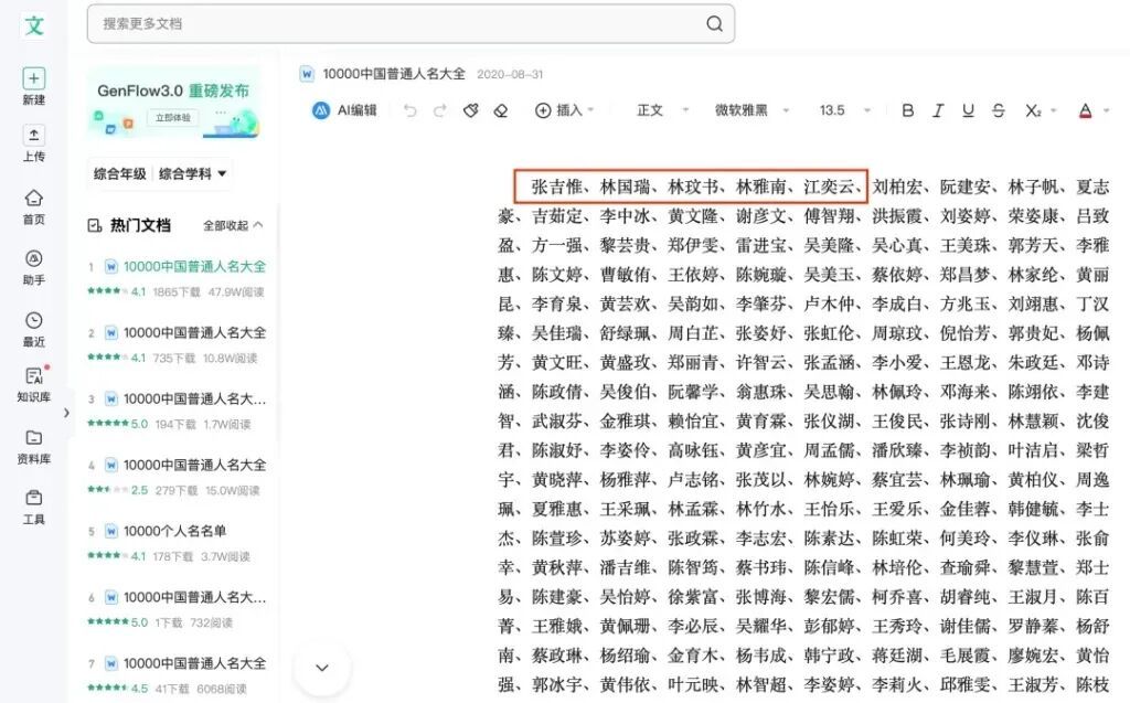 这两天,百度文库《10000中国普通人名大全》中“张吉惟、林国瑞、林玟书、林雅南、江奕云”五人的名字,被曝频繁出现在采购评审、比赛获奖名单、行政处罚公示等不同场景,引发舆论对公共事务造假的质疑,这五人也被称为“全网最忙五人组”。